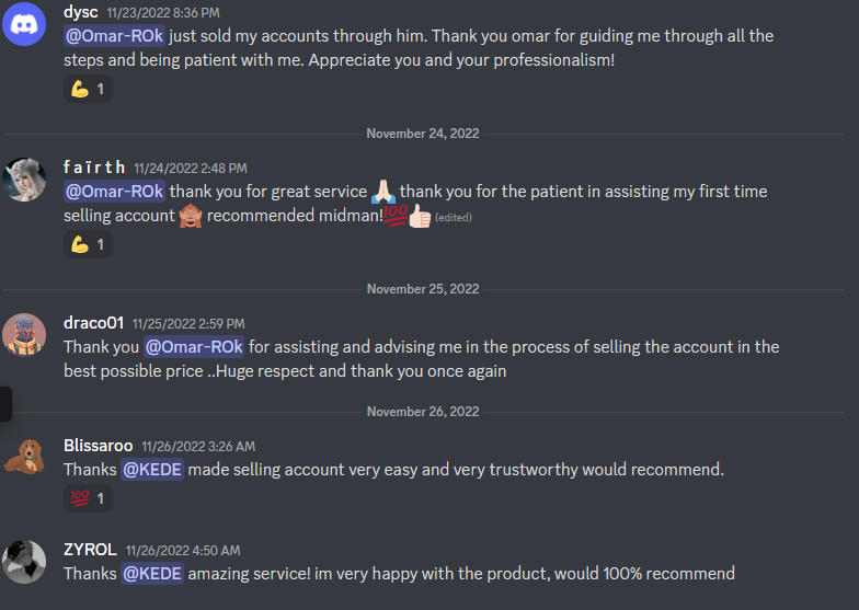 I decided to sell my account and made a spot to this group. Quickly I received an answer and recommended price. Great middlemen who made this deal so easy and safe. I didn`t even had to find buyers. This group has the highest service in this sphere and 100% safety while the process of selling.😀😀😀